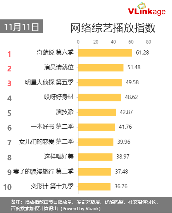 【网综榜单】11月11日当日#网络综艺播放指数#:1.#奇葩说 第六季#播放指数 61.28 2.#演员请就位#3.#明星大侦探 第五季#4.#哎呀好身材#5.#演技派#6.#一本好书 第二季#7.#女儿们的恋爱 第二季#8.#这样唱好美#9.#妻子的浪漫旅行 第三季#10.#变形计 第十九季#