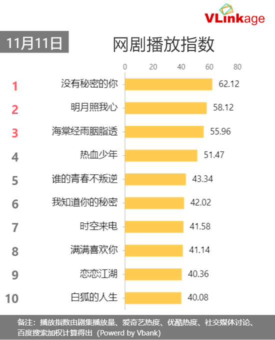 【网络剧榜单】11月11日当日#网剧播放指数#:1.#没有秘密的你#播放指数 62.12 2.#明月照我心#3.#海棠经雨胭脂透#4.#热血少年#5.#谁的青春不叛逆#6.#我知道你的秘密#7.#时空来电#8.#满满喜欢你#9.#恋恋江湖#10.#白狐的人生#