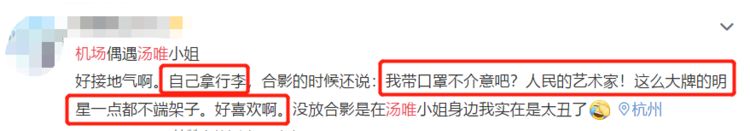 而且汤唯不仅独立自强,在和网友相处的时候也十分友善客气。有网友透露自己在机场偶遇了汤唯,称赞她自己拿行李很接地气,自己提出要和她合影的时候,汤唯还主动问网友“我戴口罩不介意吧。”对此网友力赞汤唯是“人民艺术家”,称她那么大明星一点架子都没有,很喜欢。