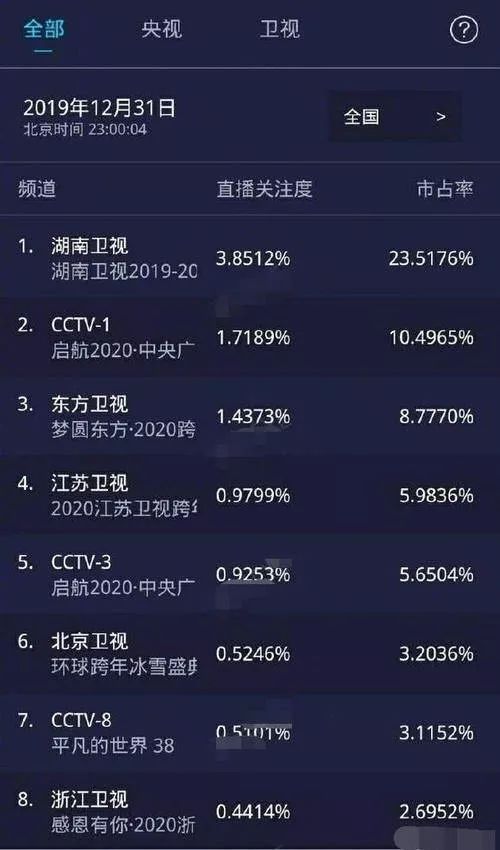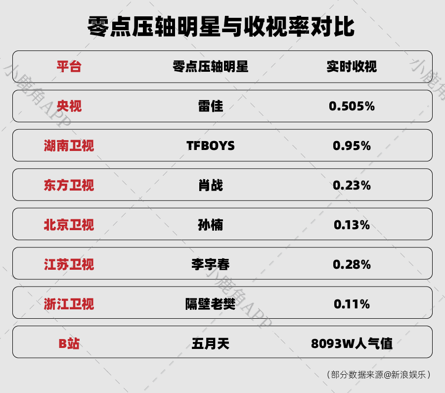 零点的意义不言而喻,收视率居首位的显然是湖南卫视,压轴艺人TFBOYS,江苏卫视压轴艺人李宇春,东方卫视压轴艺人肖战,北京卫视压轴艺人孙楠,垫底的浙江卫视压轴艺人则是2019年爆红的民谣音乐人隔壁老樊。