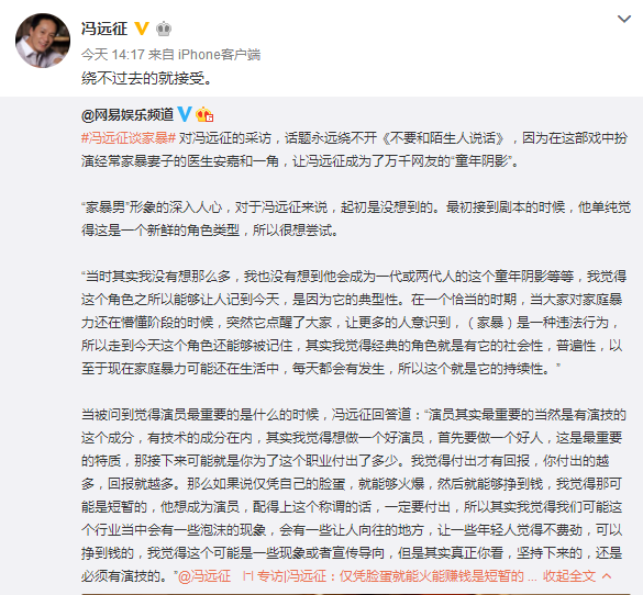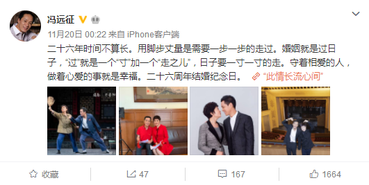 前几天,冯远征还专门发博庆祝自己和妻子26年的结婚纪念日,他说,“婚姻就是过日子,过就是一个寸加一个走之儿,日子要一寸一寸的走,守着相爱的人,做心爱的事就是幸福!”