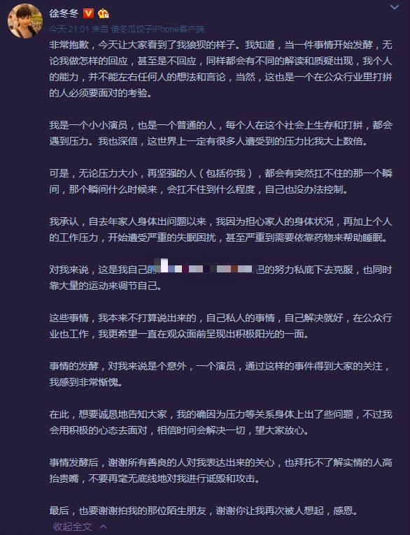 随后徐冬冬在微博解释了自己在地上哭泣的原因,她表示自己的家人身体出现了问题,因为担心家人的身体状况,加上个人的工作压力,所以她开始遭受失眠困扰,甚至严重到需要依靠药物来帮助睡眠,语言间让人倍感心疼。