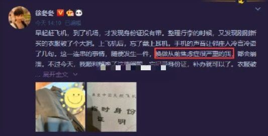 除了患有焦虑症和有睡眠困扰,徐冬冬在拍戏时也受过严重的伤。