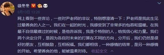 在事后有网友为此攻击尹子维时,徐冬冬还帮前男友说话,想必两人也是和平分手,好聚好散。