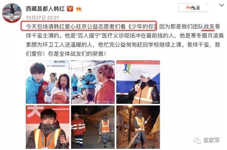 近日,韩红更博表示,她包场请韩红爱心驻京公益志愿者们包场看《少年的你》,因为这是战友易烊千玺主演的。