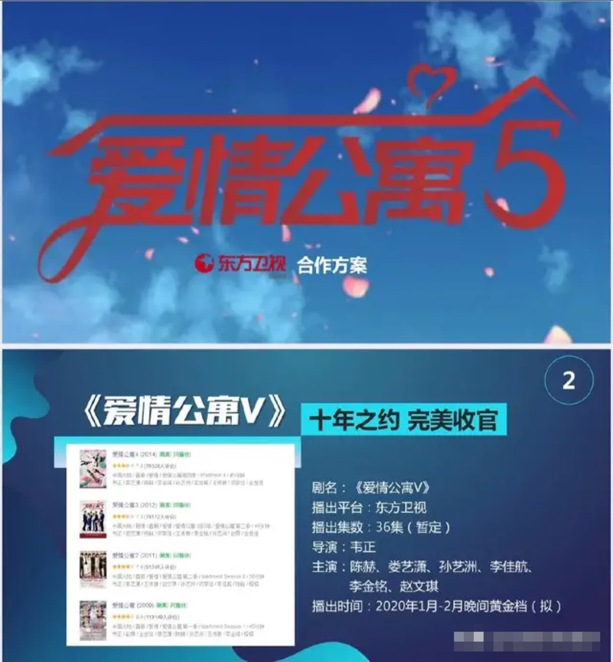 说到《爱情公寓》这最后一部可是让人特别期待,自从这部作品杀青之后,大家都是在期待可以早点定档。最近网上公布出这《爱情公寓5》要在东方卫视播出,将于2020年1—2月份东方卫视黄金档播出。虽然是拟定不过也差不多了,这部作品太热门,杀青不久就播出也是正常。而且这部作品也是最后一部,大家还是特别期待。《爱情公寓》这几季的收视率,可以说是都是特别好。