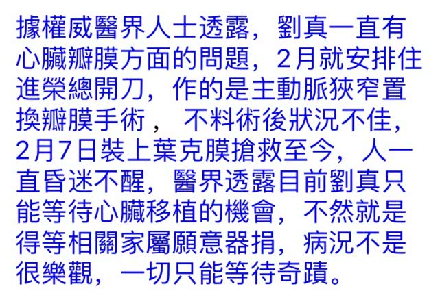据医学人士分析,目前刘真的状况很不乐观,只能等待心脏移植的机会,或者是相关家属愿意器官。