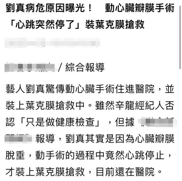 也有媒体称刘真是在手术过程中心跳停止才装上叶克膜抢救。