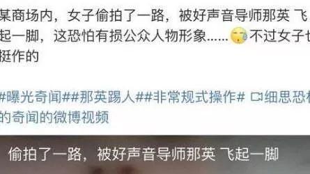 9月29日,有网友曝光了一段疑似那英踹人的视频。一位女子边嚼着口香糖,边走在那英的前面拍摄自己和她同框的视频,笑容得意,而走在她身后疑似那英的女子神情不悦,随后飞踹了她一脚,还说道“别拍我”。