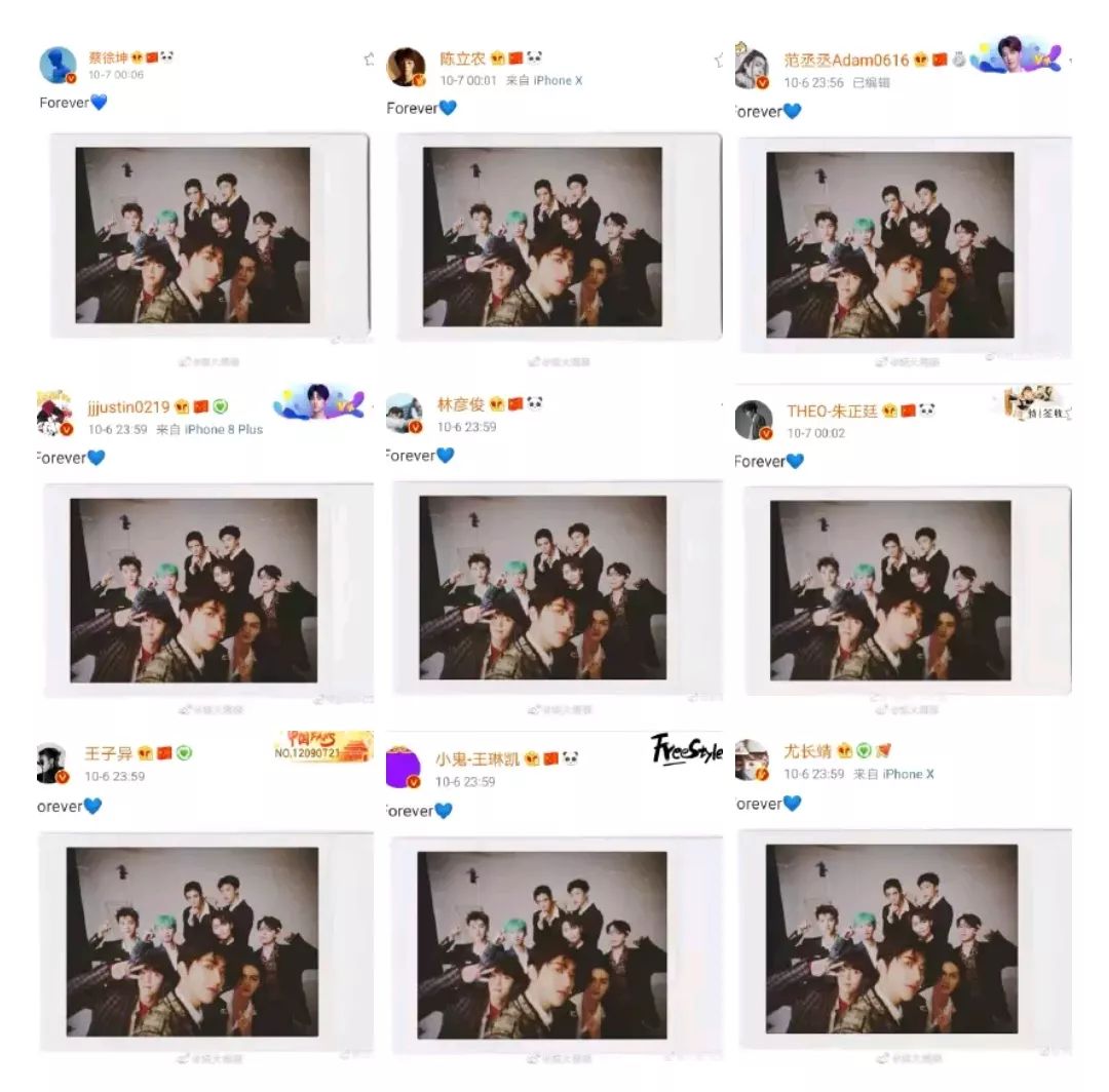 随后九尾组合成员蔡徐坤、陈立农、范丞丞、黄明昊、林彦俊、朱正廷、王子异、小鬼王琳凯、尤长靖也基本上在同一时间更新了搭配着同样文案的毕业大合照。