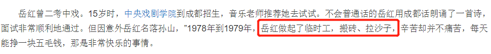 岳红从小便有一个演员梦,15岁时考取中戏却并没有入选,但她没有放弃,依旧为了追逐梦想努力。期间为了生存,她曾搬过砖,扛过沙,所幸在1980年时她顺利进入中戏求学,也让自己的演技天赋得以被发现。