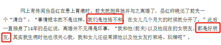 不过看似平静的日子并没有持续多久,因为长时间的不规律饮食,岳红在40岁的时候被检查患胃癌。当时患癌消息刚被曝出,很多网友都指责前夫是因为女方患病才无情抛弃她。不过对于这个说法,岳红很快就回应两人其实是和平分手,如今早已成为朋友。