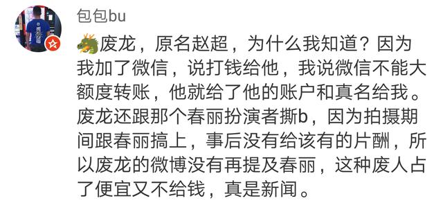 对此,网友们纷纷留言吐槽道:“她都没有理过你吧?”、“就你也配艾特他们吗?还妻子的第一人选,自己没一点数?”、“关你锤子事”、“大家都散了吧,关注一个傻子会降低智商的。”、“不,我要看它能傻到什么程度”、“废龙,原名赵超,为什么我知道?因为我加了微信,说打钱给他,我说微信不能大额转账,他就给了他的账户和真名给我。废龙还跟那个春丽扮演者开撕,因为拍摄期间跟春丽搞上,事后没有给该有的片酬,所以废龙的微博没有再提及春丽,这种废人占了便宜又不给钱,真是新闻。”