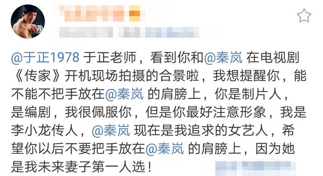 当得知著名编剧于正前不久与秦岚合拍一部电影的消息,而且于正还把手搭在秦岚肩膀上合影,飞龙看到这一幕后就气不打一处来,于是他对于正提出了警告:“于正老师,看到你和秦岚在电视剧《传家》开机现场拍摄的合景啦,我想提醒你,能不能不把手放在秦岚的肩膀上,你是制片人,是编剧,我很佩服你,但是你最好注意形象,我是李小龙传人,秦岚现在是我追求的女艺人,希望你以后不要把手放在秦岚的肩膀上,因为她是我未来妻子第一人选!”