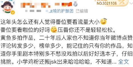 很多粉丝掐架就是因为正主的番位问题,有些双男主/女主的戏必须要分个谁前谁后还能勉强理解,但这种性别不一样,都是X一号的爱情戏有必要也分吗?不同的剧组对番位要求不一样,有的是看谁拉来的赞助代言多谁就是一番,有的是靠公司谈条件谈下来,所以粉丝影响不了的。但粉丝力量大啊,没官宣超话阅读量就都破2亿了,所以眼看粉丝都撕了官博还不出来,也是闷声赚大钱了。