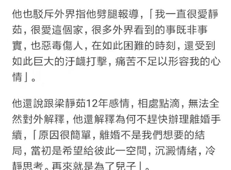 此外,赵元同还否认了外界对他的劈腿指控,他写道:“我一直很爱静茹,很爱这个家,很多外界看到的事情既非事实,也恶毒伤人。在如此困难的时刻,还遭到如此巨大的打击,痛苦不足以形容我的心情。”