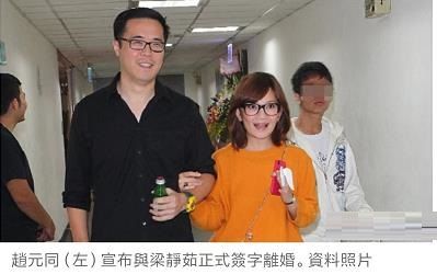 今年8月,梁静茹和赵元同被曝出离婚的消息,台媒曝料夫妻二人婚变原因是因为赵元同有了外遇,出轨了自己的女同事,导致和梁静茹感情破碎。亦有另一份曝料指赵元同两年前就已经劈腿女网红,被梁静茹发现并原谅后再犯,所以才使得夫妻感情不再。但是这些遭到男方否认。9月时梁静茹在音乐会上,泪流满面承认自己和赵元同正在办理离婚手续,五岁的儿子将会由二人共同抚养。