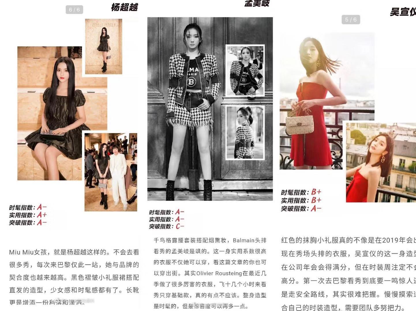 杨超越被评三A,孟美岐才2A1C,而吴宣仪1A2B,孟美岐的表现没有特色很乱,而吴宣仪的单一,杨超越一袭黑色丝绒斗篷真的很抢眼。孟美岐应该比杨超越在时尚方面出色,想不到这次被抢了风彩,因为她并不是第一次参加这种大型海外秀场。杨超越颜值高身材也很不错,所以很容易出彩。