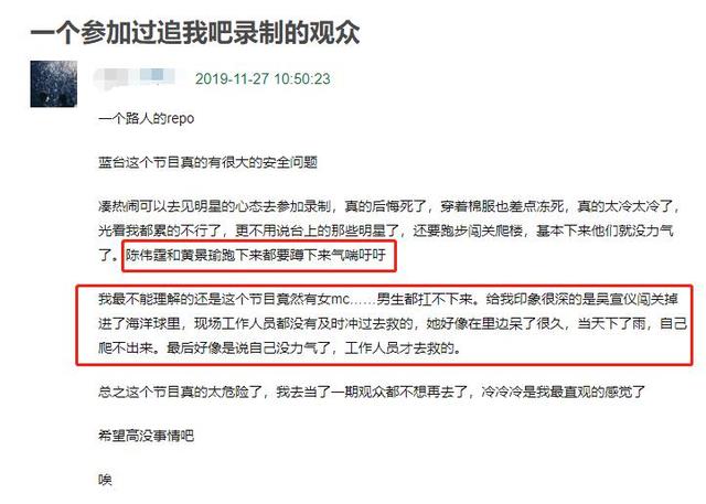 首先,这个节目的安全真的十分有问题。在极端恶劣的天气,要求MC半夜录制,现场真的很冷,陈伟霆和黄景瑜跑下来都要蹲下来气喘吁吁。