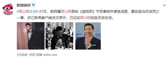 而就在三分钟前,新浪娱乐发了声明,高以翔救治无效,死亡。
