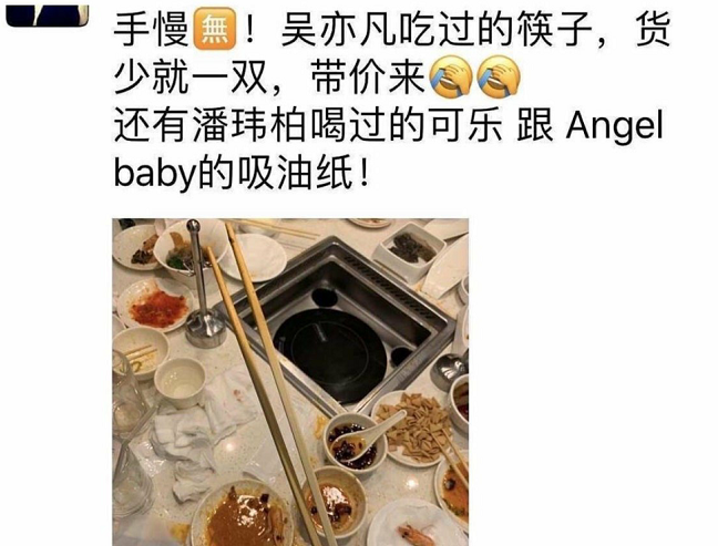 有一晚,几位明星录制完综艺下班后,被安排在了一家火锅店聚餐,由于他们是明星的缘故,为防止被一些粉丝认出打扰,所以吴亦凡他们在餐厅的包厢内聚餐,所以并未流出聚餐过程的照片。让人意想不到的事情发生了,待几位明星用餐结束后,有一代购竟然悄悄潜入包厢内,拍下了明星的饭后残羹,并在朋友圈进行拍卖。