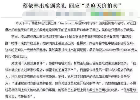 蔡依林曾经也被外界人士利用,打着明星吃过的烧饼为噱头,拍卖饼上的23粒芝麻,如此不起眼的东西,竟然拍卖价为1万元人民币,真是让人难以理解。