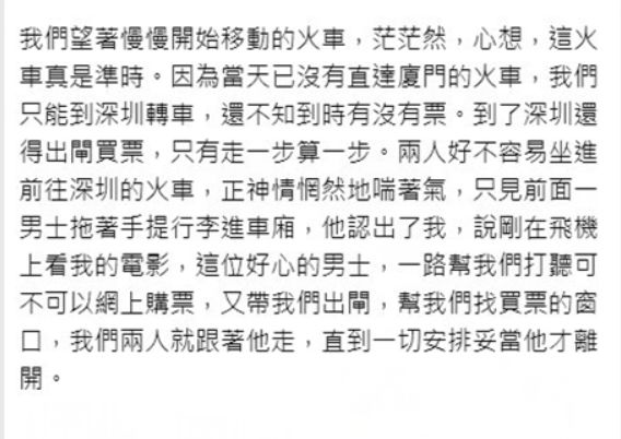 幸运的是,刚坐上到深圳的列车,林青霞就被一位男士认出。之后,该男士帮她们打听网上买票、带她们出闸买票,为她们打点一切。