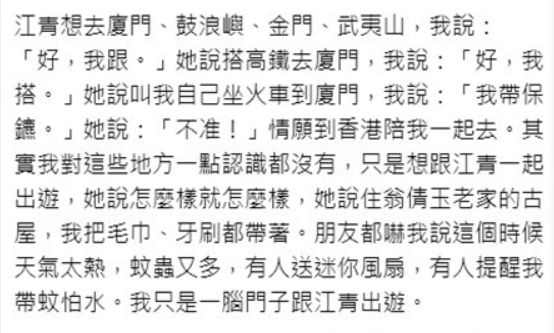 这次旅行由江青提议,林青霞兴冲冲地跟上,不过她带保镖的提议被江青一口否决,宁愿自己到港陪林青霞坐高铁。