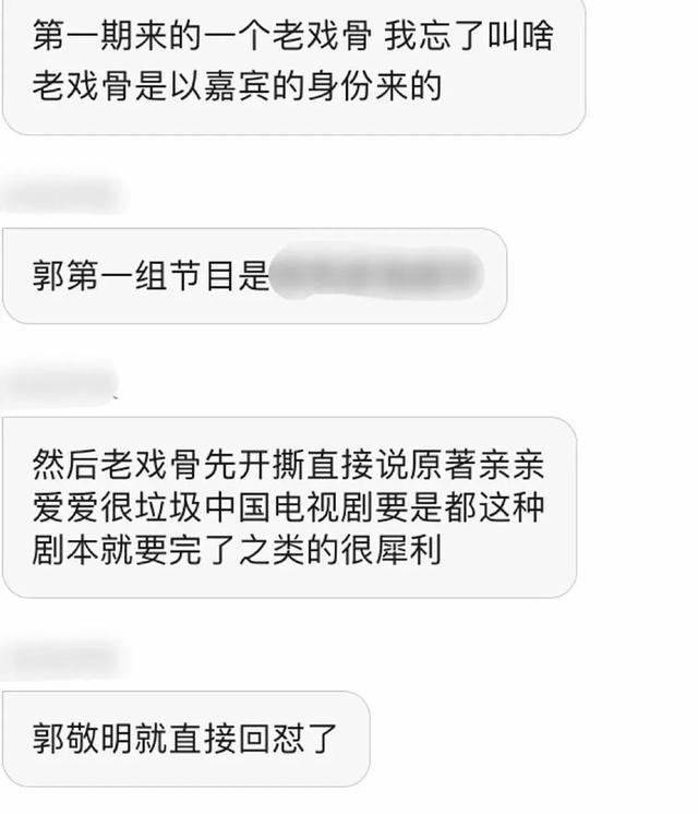 此前就有参与录制这场节目的现场观众爆料,表示有老戏骨抨击原著情情爱爱很垃圾,中国电视剧要都是这种剧本就要完了,也难怪郭敬明的脸色会很难看了。不过据观众爆料,郭敬明也立即回怼了,导致当时场面一度十分尴尬,沙溢作为主持人还想尽力救场,几次想打断两人的对话结果都没成功。现在看来,这个老戏骨说的应该就是李诚儒了。