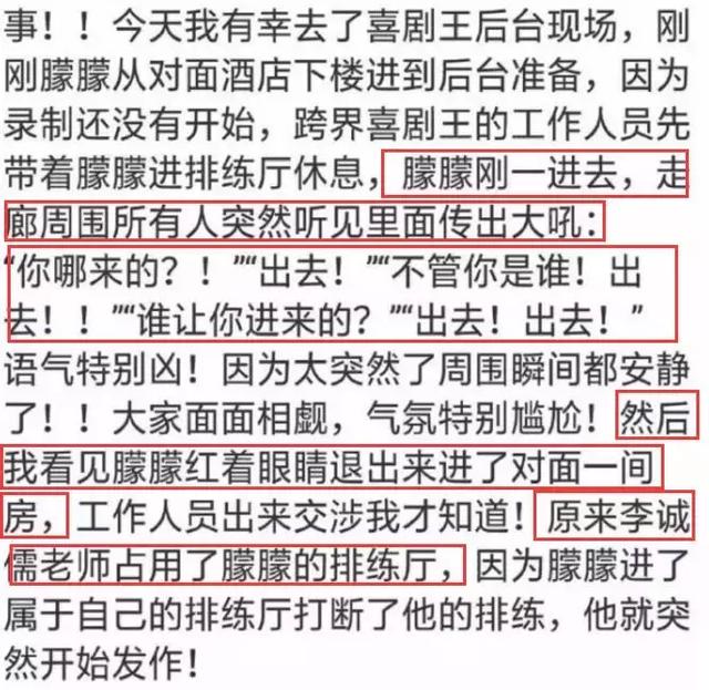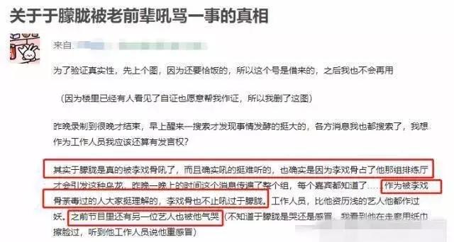 后来事情有了反转,有人称自己询问过工作人员,李诚儒并没有欺负新人,之所以骂于朦胧是因为他耍大牌迟到,而所谓的于朦胧的个人排练厅其实也不尽然,而是大家共同的排练厅。