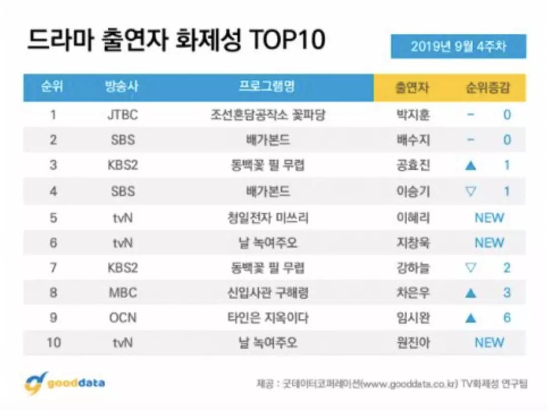 9月第四周的「电视剧演员」话题性TOP.10中,男女主纷纷上榜。