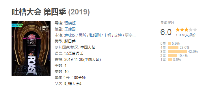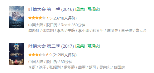 首先从节目评分开始看,上文说了《吐槽大会》第一季有7.5分,第二季节目稍稍逊色,但也有6.9分,在这两季节目中,李诞和池子的出现频率还是很高的。