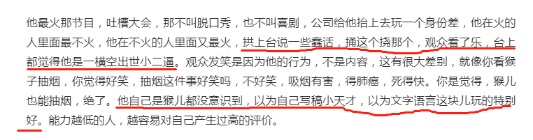 池子走红之后,在微博写了长文,以第三人称的口吻对自己进行的猛烈的抨击。他说自己在《吐槽大会》上只是一个逗人发笑的猴,实际什么真本事也没有。