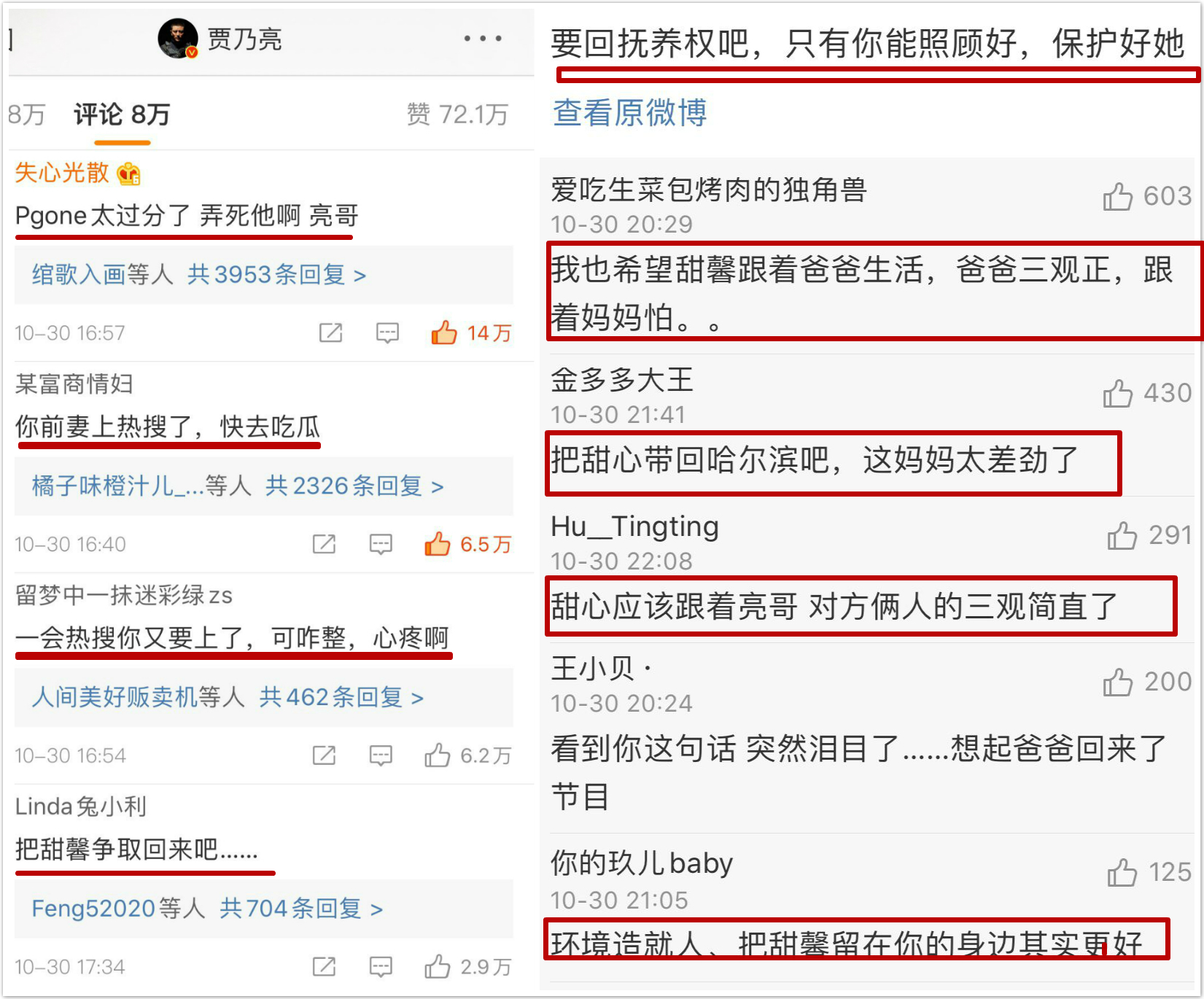 给贾乃亮留言的大多是劝慰贾乃亮,请他尽快抢回甜馨的抚养权。