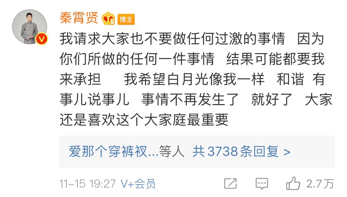 不过,后来秦霄贤再发了一条微博:我请求大家也不要做任何过激的事情。因为,你们所做的任何一件事情,结果可能都要我来承担。我希望白月光像我一样和谐。有事儿说事儿,事情不再发生了就好了。大家还是喜欢这个大家庭最重要。