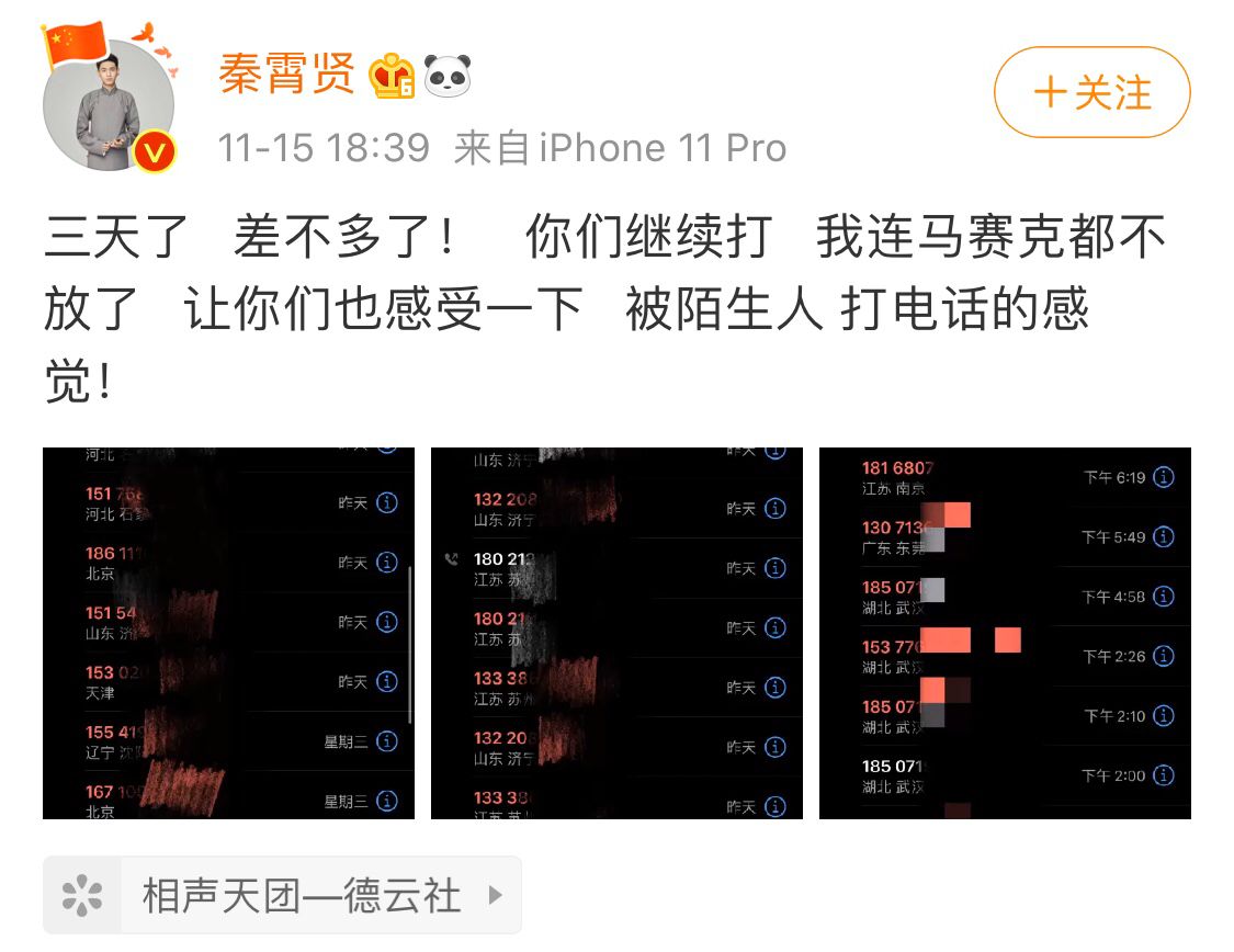 11月15日晚上6点半多,德云社秦霄贤发微博称,自己遭遇陌生人电话骚扰已经3天了。