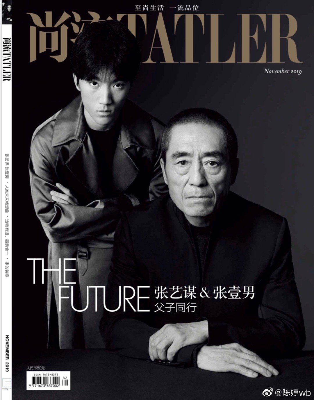 照片中,张艺谋穿着大衣表情严肃地坐着,虽然已经是满脸皱纹,但是他眼神依旧有光。大儿子张壹男穿着风衣抄着手站在老爸后面,目光坚定地看着前方,十分有范儿。父子俩合体登杂志封面,实属罕见啊,也不得不说张壹男完全是妈妈陈婷的翻版,五官真是太像了。