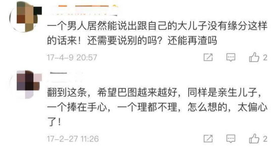 人常说说手心手背都是肉,可是在英达这里可没有这个说法,他的眼里只有小儿子,对巴图却忽视和冷漠,这也引起了网友们的忿忿不平。甚至有网友为宋丹丹娘俩打抱不平,称真的看不下去了,整的巴图不是他儿子似的。小8想,同样是自己的孩子,英达的差别对待简直不要太明显哦!