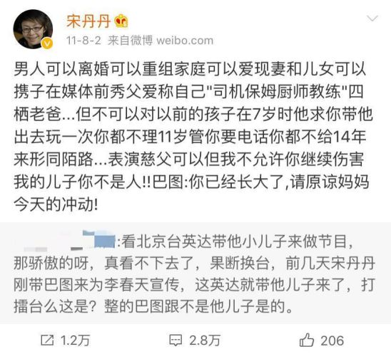 对于英达对待巴图的不公平,宋丹丹也是在微博上大吐苦水,她称巴图请求英达陪他出去玩一次,却遭到英达的拒绝,而且父子两人14年来形同陌路。