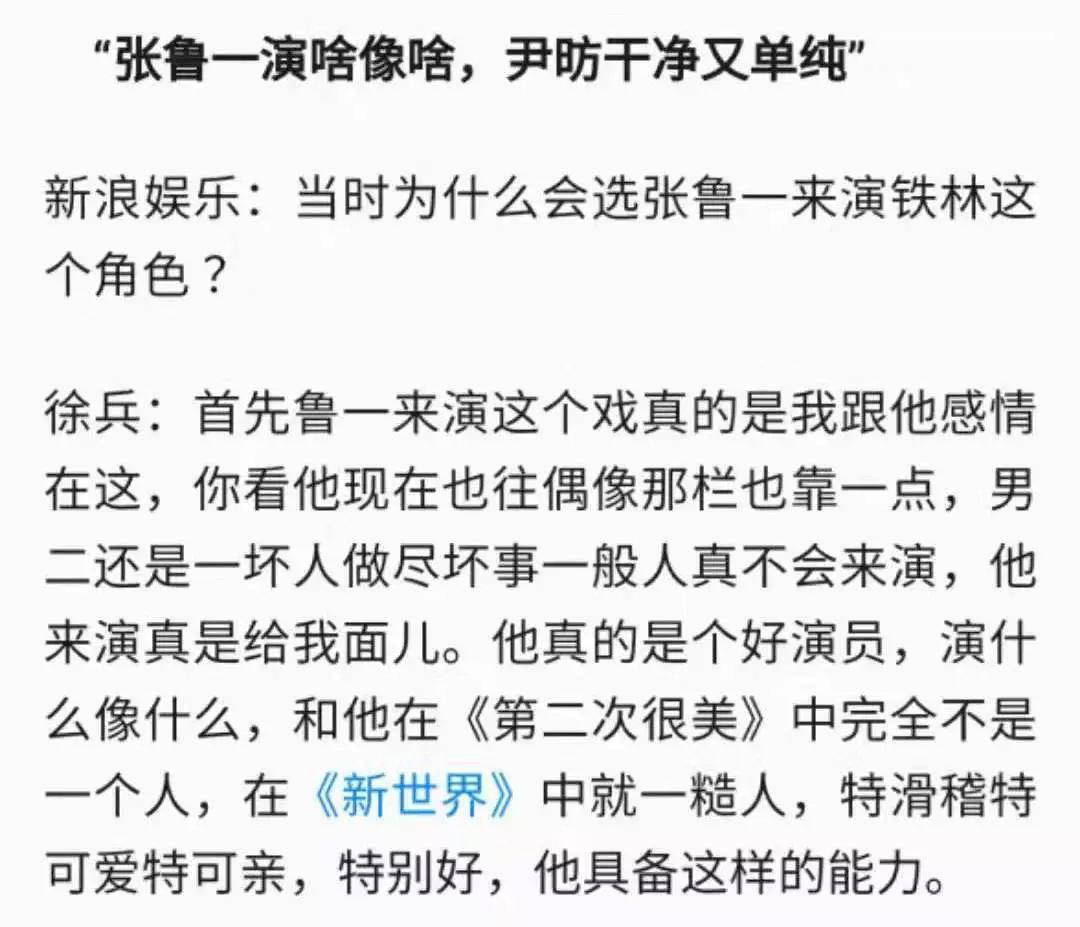 张鲁一和徐兵导演也算是老相识了,从之前《红色》到现在《新世界》,张鲁一能接这么个招人恨的角色估计也是有感情分吧,因为一般人真的不愿意演,徐兵之前接受媒体采访的时候也说张鲁一是“演什么像什么”。