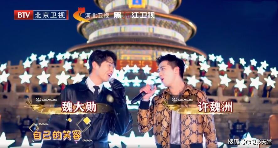 肖战身穿一件大红色风衣内搭蓝色衬衣条纹领带,面带微笑非常温暖,张艺兴则身穿枣红色西装,表情冷峻,但是造型就已经惊艳了观众。两人合作带来了开场第一首歌曲《我们都是追梦人》,难怪在跨年演唱会开始之前,两人会微博互关了。