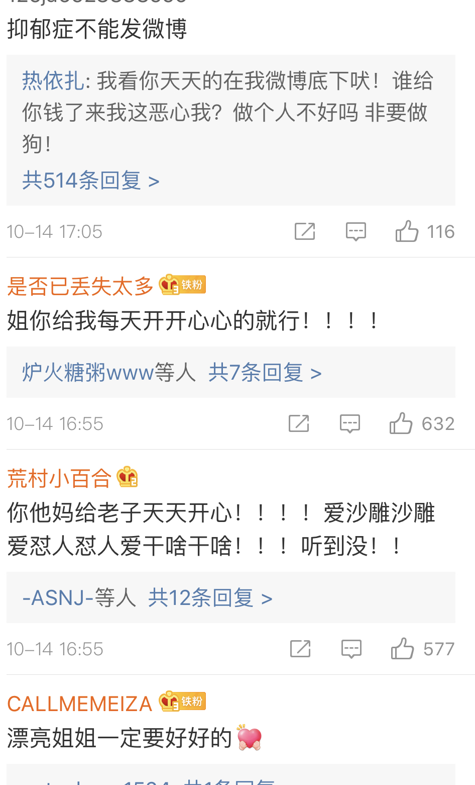 希望热依扎的微博评论能够一直都是这种非常温暖且有爱的吧,她曾经连穿衣服也要被大家评论说不得体什么的,也曾经因此和大家致歉。但对于一个患有抑郁症的艺人,还是希望大家能够宽容一些,嘴下留情吧。有些事情,显然已经为时已晚,但有些事情,并非没有机会及时止损。