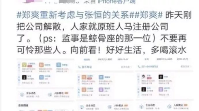 今年十一月底,网曝张恒郑爽解散了两人合开的公司,随后,有网友发现,张恒朋友原班人马又注册了新公司,这家新公司张恒没有立刻入股,但股东和法人都是张恒的两位好哥们。而今年年初郑爽和男友成立的新公司,大股东里已经没有了郑爽。