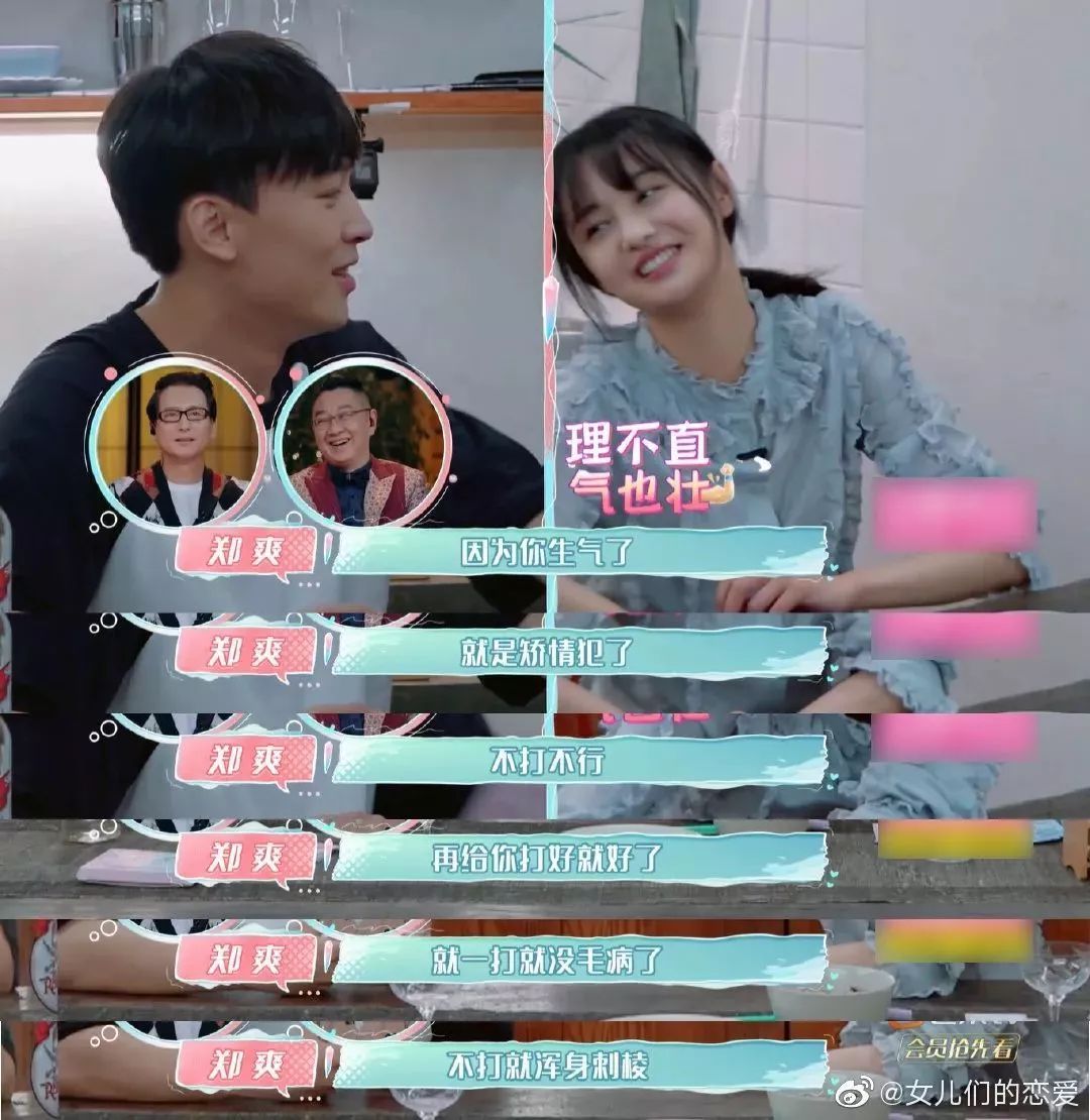 另外,郑爽处理问题的方式似乎也和正常情侣不同——发现对方生气了怎么哄他?郑爽的答案是“打他”,理由是只要张恒生气,就是矫情犯了,讲话也不理就只能打。