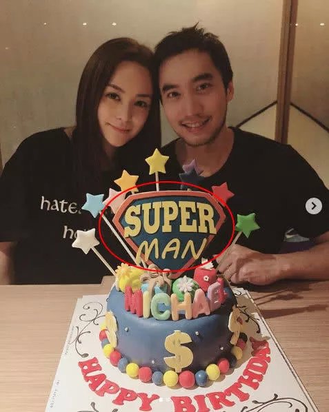 赖弘国手捧着一个大蛋糕,阿娇整个人趴在他身上一脸甜笑,二人看起来仍如新婚时一样甜蜜。