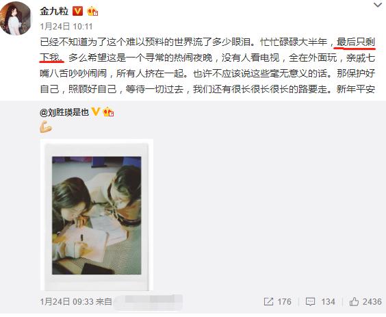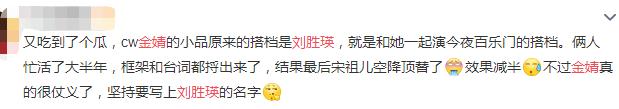 不过据说这个节目原本金婧是和老搭档刘胜瑛合作演出的。在除夕夜当晚,金婧在微博发文感叹:“忙忙碌碌大半年,最后只剩下我。”语气间没有登上春晚的兴奋,反而满是遗憾。她还转发了刘胜瑛的微博,刘胜瑛晒出了两人埋头看剧本的照片,疑似是之前两人在为春晚小品剧本而努力。