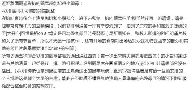 该观众还提到肖战的小品,在原来彩排的版本中,结束时肖战和谢娜等人还会和第一排观众拍手互动,并且走进观众席送出小玩偶,这部分互动在播出时是被删掉了。其他嘉宾送玩偶互动的环节也删掉了,开场时给观众送礼物送福字的部分也是如此。