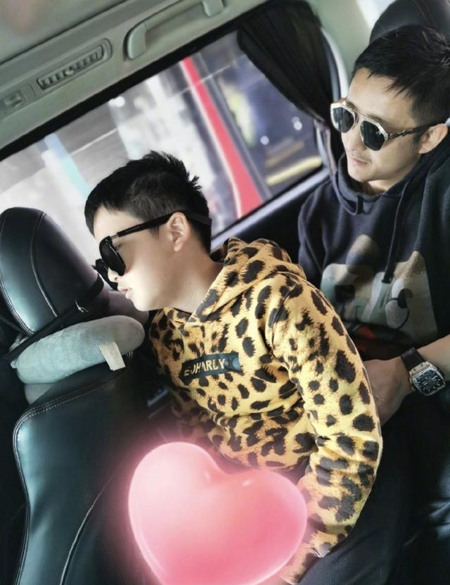 轩轩坐在爸爸的怀里,穿着豹纹卫衣,戴着墨镜很是洋气,现在的轩轩感觉邹市明都要抱不过来了。