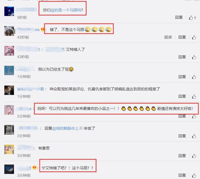 很多网友看了小品纷纷艾特马丽,引起了不少网友的调侃。有网友说:“错了,不是这个马丽。”“艾特错人了。”还有网友大呼:妈呀!可以列为我这几年来最喜欢的小品之一!! 剧情还有演技太好啦。还有网友说:我以为已经生了。