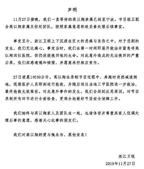 11月27日凌晨,高以翔在录制浙江卫视《追我吧》节目时,突发意外晕倒,经抢救无效离世。此事引起了外界的高度关注!
